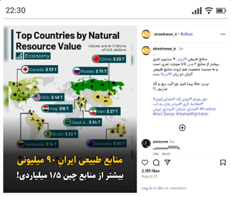 یک صفحه اینستاگرامی در پستی مدعی شده است که ارزش منابع طبیعی ایران از چین بیشتر است. این صفحه با اشاره به جمعیت بسیار کمتر ایران نسبت به چین، همچنین ادعا کرده است که ارزش منابع طبیعی ایران به نسبت جمعیت، حتی دو برابر آمریکا است.