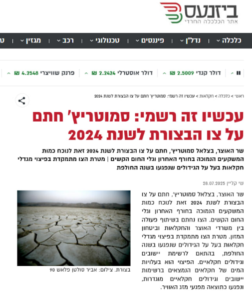 - بزالل اسموتریچ در تاریخ ۶ مرداد ۱۴۰۴، با توجه به کاهش بارندگی و گرمای شدید، فرمان مقابله با خشکسالی یکسال گذشته را صادر کرد. طبق این دستور، فهرستی از شهرکها و محصولات کشاورزی آسیبدیده باید تهیه شود تا غرامت آنها پرداخت شود.