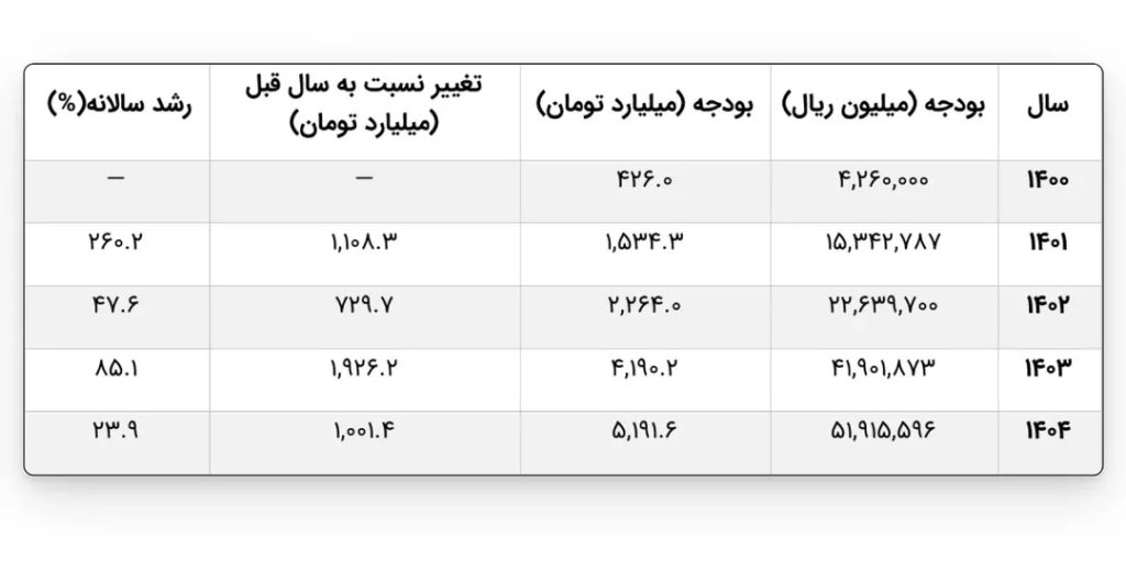 این رقم در قانون بودجه سال ۱۴۰۴ به حدود ۵٬۱۹۱ میلیارد تومان رسیده است.