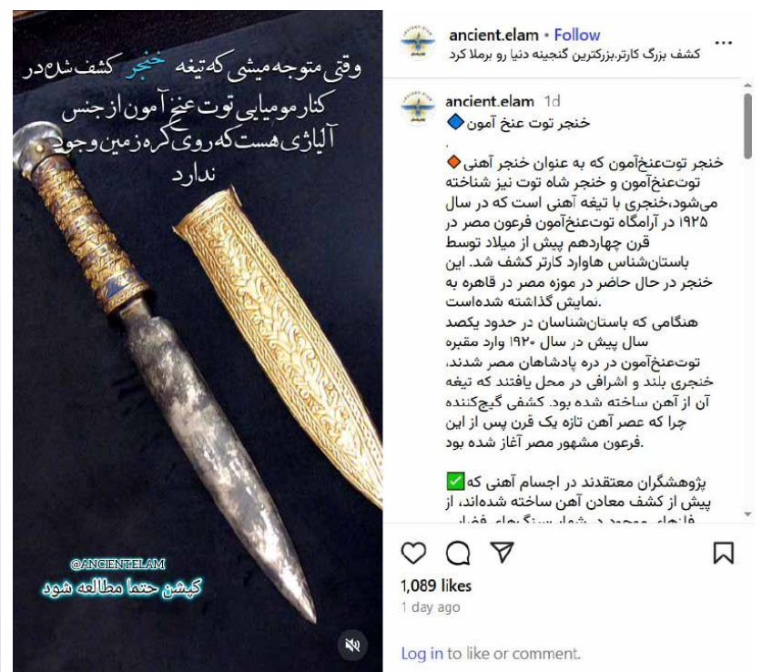 یک صفحه اینستاگرامی در پستی مدعی شده است که خنجر توتعنخآمون، که در کنار مومیایی این فرعون مصر یافت شده است، از ترکیب فلزی ساخته شده است که در سطح زمین وجود ندارد.