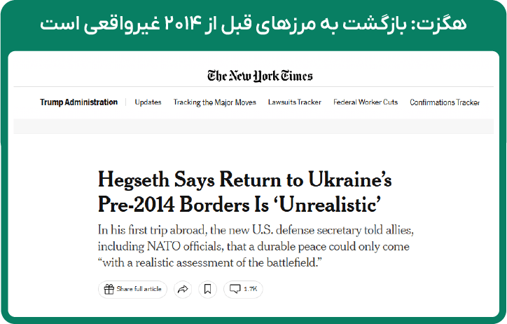 بر اساس گزارش نیویورکتایمز، در طرح پیشنهادی ترامپ برای پایان جنگ اوکراین، بازگشت این کشور به مرزهای پیش از ۲۰۱۴ «غیرواقعی» دانسته شده و عضویت اوکراین در ناتو نیز بخشی از طرح صلح محسوب نمیشود. این موضع پس از اظهارات وزیر دفاع آمریکا در نشست ناتو و تماس تلفنی ترامپ با پوتین مطرح شده است.