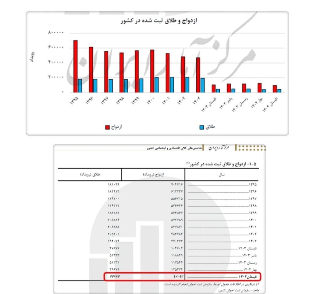 اقتصاد آنلاین گزارش داده است که آمار طلاق در ایران رکورد زده و تعداد ازدواجها به زیر ۱۰۰ هزار مورد رسیده؛ همچنین آمار ازدواج در تابستان ۱۴۰۴ نسبت به تابستان سال قبل ۷ درصد کاهش داشته است.