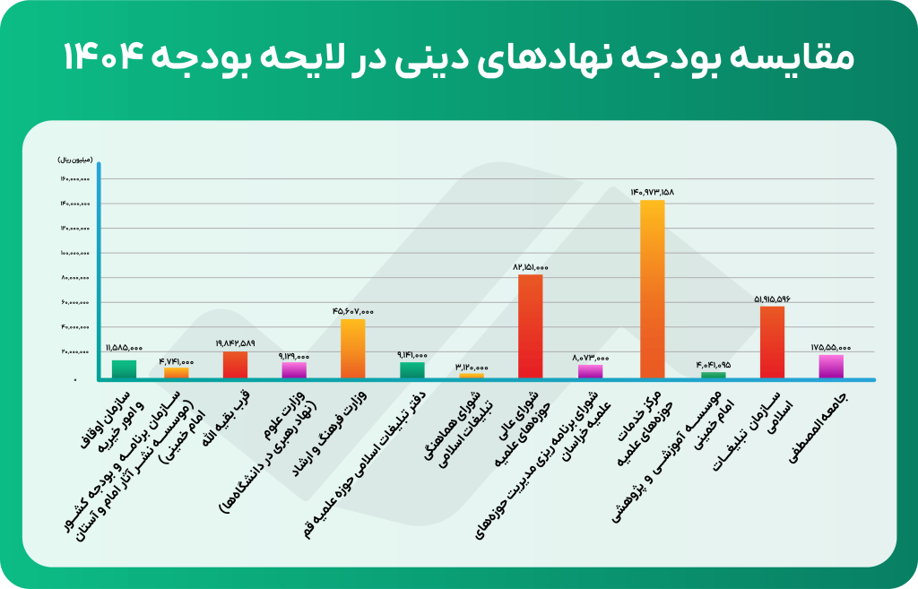 سهم دستگاههای دین در بودجه ۱۴۰۴ حدود ۴۰ همت است که تنها ۰.۷۵٪ از مصارف بودجه عمومی ۵۳۸۴.۴ همت را تشکیل میدهد و نسبت به سال قبل ۲۵٪ رشد داشته است.