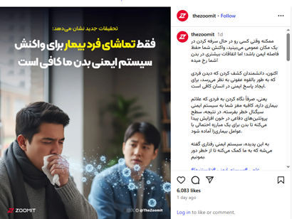 صفحهی اینستاگرامی زومیت در پستی مدعی شده است که دانشمندان کشف کردهاند صرف نگاه کردن به فردی که علائم بیماری دارد، برای مغز کافی است تا به سیستم ایمنی سیگنال خطر بفرستد و بدن را برای مبارزهی احتمالی با عوامل بیماریزا آماده کند.