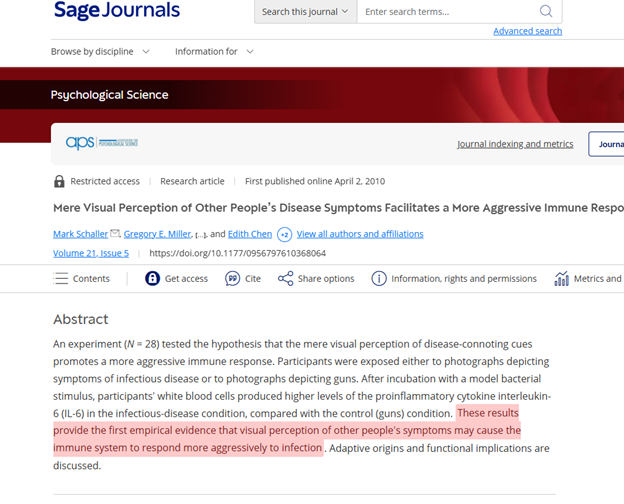 نتایج یک مقالهی منتشرشده در ژورنال Psychological Science در سال 2010 نشان میدهد که صرفاً ادراک بصری نشانههای بیماری، میتواند پاسخ ایمنی تهاجمیتری را برانگیزد. بهطوریکه این ادراک بر عملکرد ایمنی خود فرد مشاهدهکننده تأثیر میگذارد. علاوه بر این، دیدن نشانههای بیماری در دیگران میتواند احساس انزجار ایجاد کند؛ احساسی که با فعالسازی سیستم عصبی، ما را به دوری از خطر بیماری وادار میسازد.