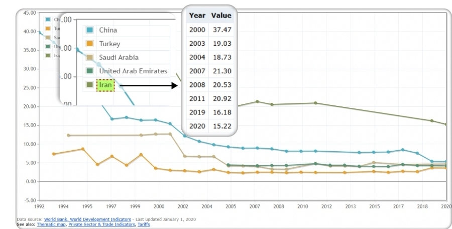 بر اساس آخرین دادههای بانک جهانی (۲۰۲۰) میانگین ساده تعرفه اعمالشده بر تمامی کالاها در ایران ۱۵.۰۲ درصد ثبت شده است.